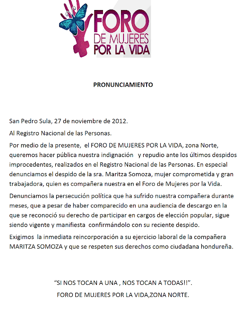 Honduras: Pronunciamiento‏ de FORO DE MUJERES POR LA VIDA