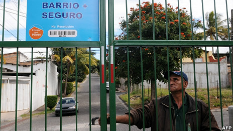 | Un guardia de seguridad vigila la puerta de entrada a una zona residencial de la capital hondureña, Tegucigalpa. |