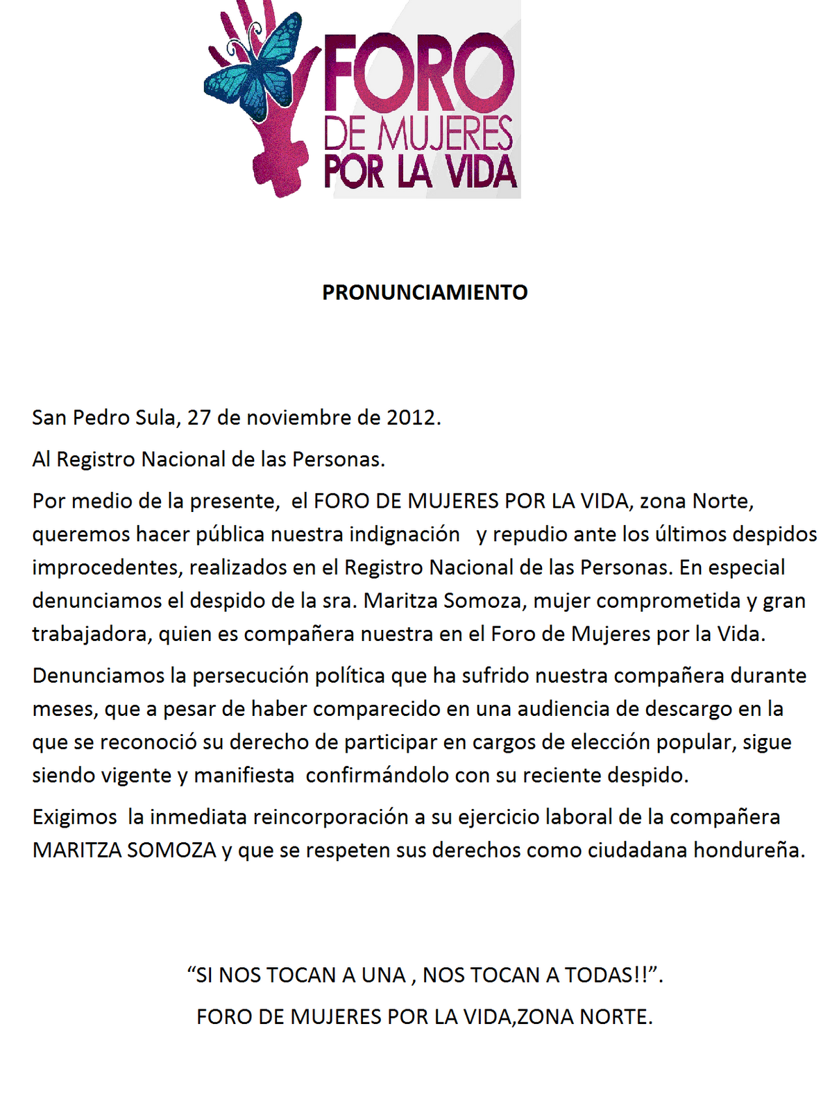 Honduras: Pronunciamiento‏ de FORO DE MUJERES POR LA VIDA