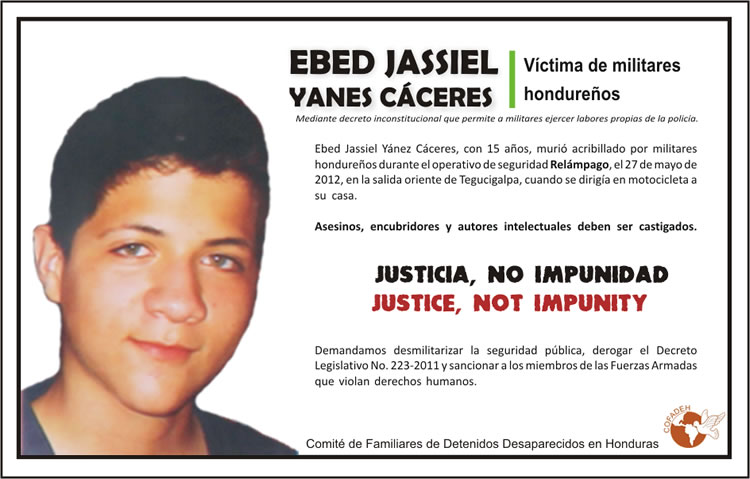 Al cumplirse hoy un año de la muerte violenta de Ebed Jassiel Yanes Cáceres (15 años) a manos de una patrulla militar en el sector de Villa Vieja, familiares demandaron justicia tanto para los militares que dispararon contra el menor como contra oficiales de alto rango de las Fuerzas Armadas (FFAA) que obstaculizaron el proceso de investigación, manipularon las pruebas y trataron de encubrir a los victimarios del menor, en un hecho acontecido la madrugada del 27 de mayo de 2012.