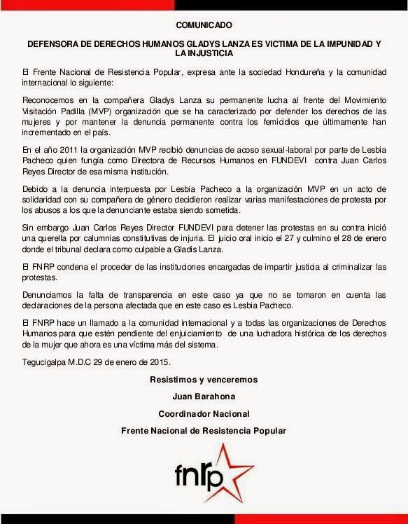 El Comité de Familiares de Detenidos Desaparecidos en Honduras, (COFADEH) con suma preocupación se pronuncia en ocasión de la sentencia verbal pronunciada por el La Sala Uno del Tribunal de Sentencia de Francisco Morazán, que este 28 de enero de 2015, declaró culpable a Gladys Lanza, Coordinadora del Movimiento por la Paz Visitación Padilla, por el delito de difamación constitutiva de calumnias.