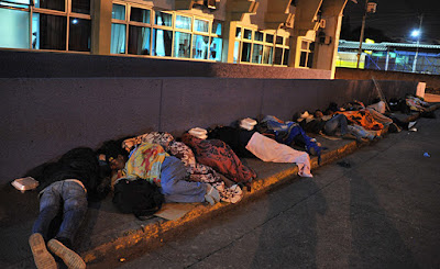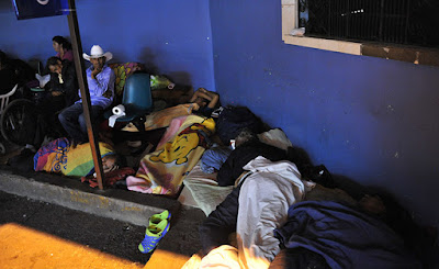 Cuando el reloj marca las 10:30 de la noche, poco a poco las personas, fatigadas de cansancio y preocupaciones, se colocan frente a la emergencia del complejo hospitalario para acomodar sus cartones, que les sirven de camas y arroparse con sábanas. De almohadas usan las mochilas o pequeñas maletas, con las que andan durante el día, de arriba para abajo. Encima se echan un trapo; a unos les basta una cobija, a otros, una toalla para descansar un poco y taparse del sereno y arrecio del frío de las madrugadas dicembrinas.
