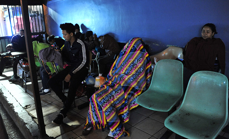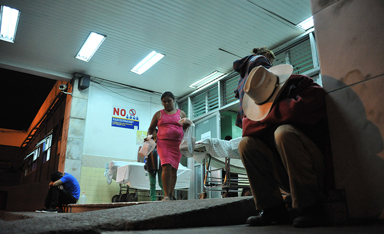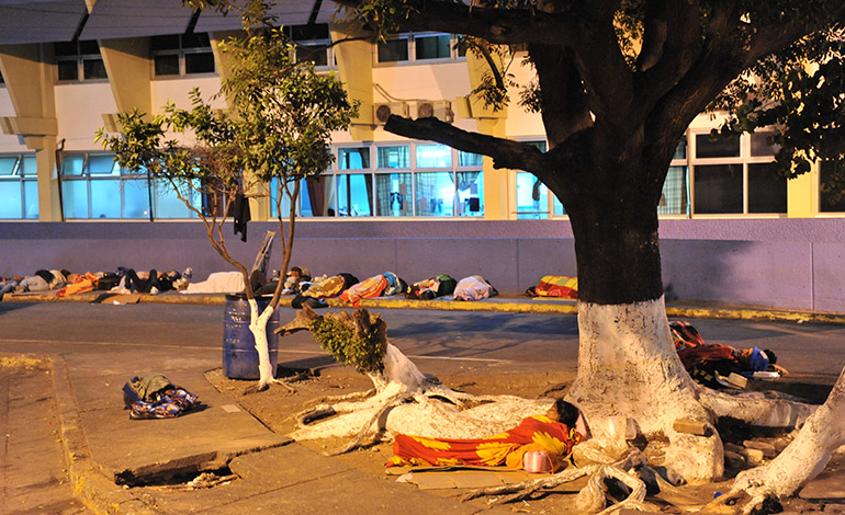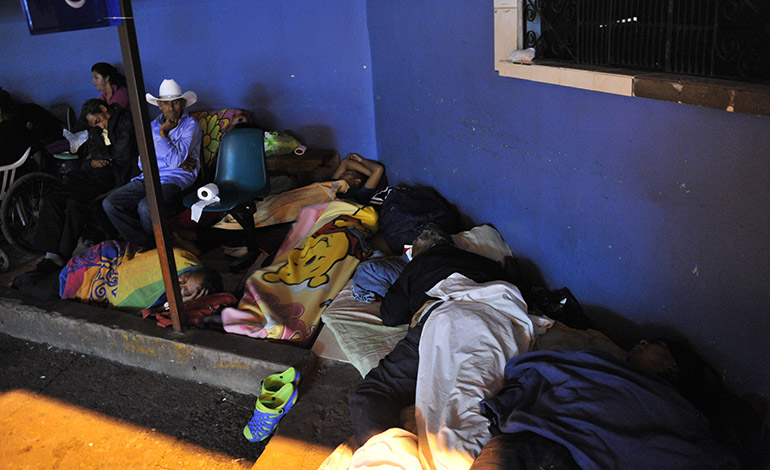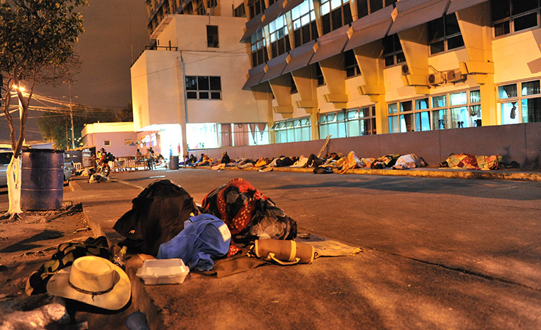 Cuando el reloj marca las 10:30 de la noche, poco a poco las personas, fatigadas de cansancio y preocupaciones, se colocan frente a la emergencia del complejo hospitalario para acomodar sus cartones, que les sirven de camas y arroparse con sábanas. De almohadas usan las mochilas o pequeñas maletas, con las que andan durante el día, de arriba para abajo. Encima se echan un trapo; a unos les basta una cobija, a otros, una toalla para descansar un poco y taparse del sereno y arrecio del frío de las madrugadas dicembrinas.