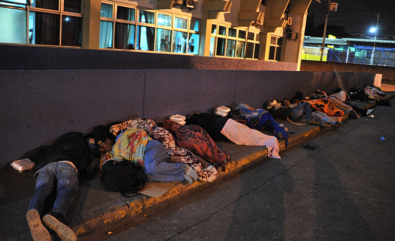 Cuando el termómetro desciende a 12 grados, ellos se acurrucan unos con otros para no quedar “muertos” de frío. Se trata de centenares de familiares de pacientes del Hospital Escuela Universitario (HEU), quienes al no tener dinero para pagar un alojamiento en otro lugar, optan por dormir sobre cartones afuera del centro de atención.