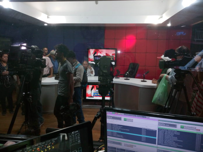 golpes en la puerta de entrada a la cabina de transmisióna, anunciaban la captura judicial contra el periodista David Romero Ellner, este jueves 28 de marzo.