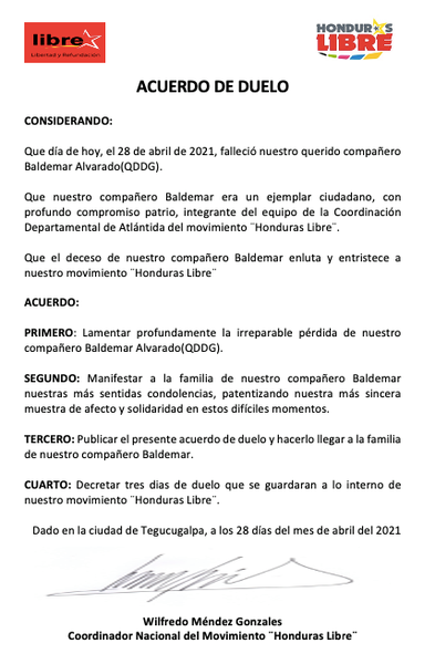 Tegucigalpa, 28 de Abril,2021 Nota de duelo por fallecimiento de compañero de lucha inclaudicable Joaquín Baldemar Alvarado fallecido esta fecha.