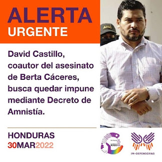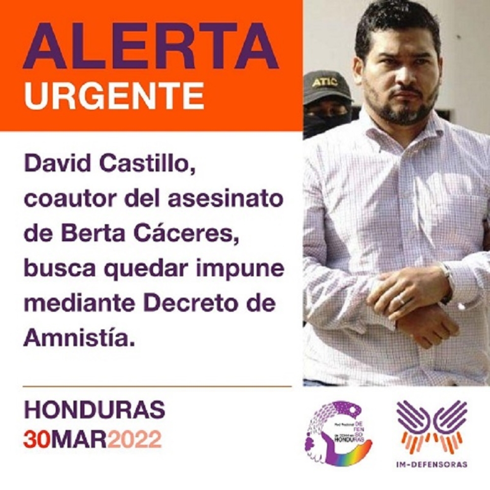 Posted On Miércoles, 30 Marzo 2022 11:17. Written by Dina Meza. Este 31 de marzo de 2022 el Tribunal de Sentencia en Materia de Corrupción tiene programada una audiencia para discutir la petición de los abogados de David Castillo para que se archiven las diligencias en su contra relacionadas con la acusación sobre uso de documento falso y fraude sobre el Gualcarque, para lo cual los apoderados legales del encausado pretenden invocar el decreto de amnistía para presos y perseguidos polpiticos, según una alerta difundida por la Red de Defensoras de Derechos Humanos en Honduras, este 30 de marzo de 2020.