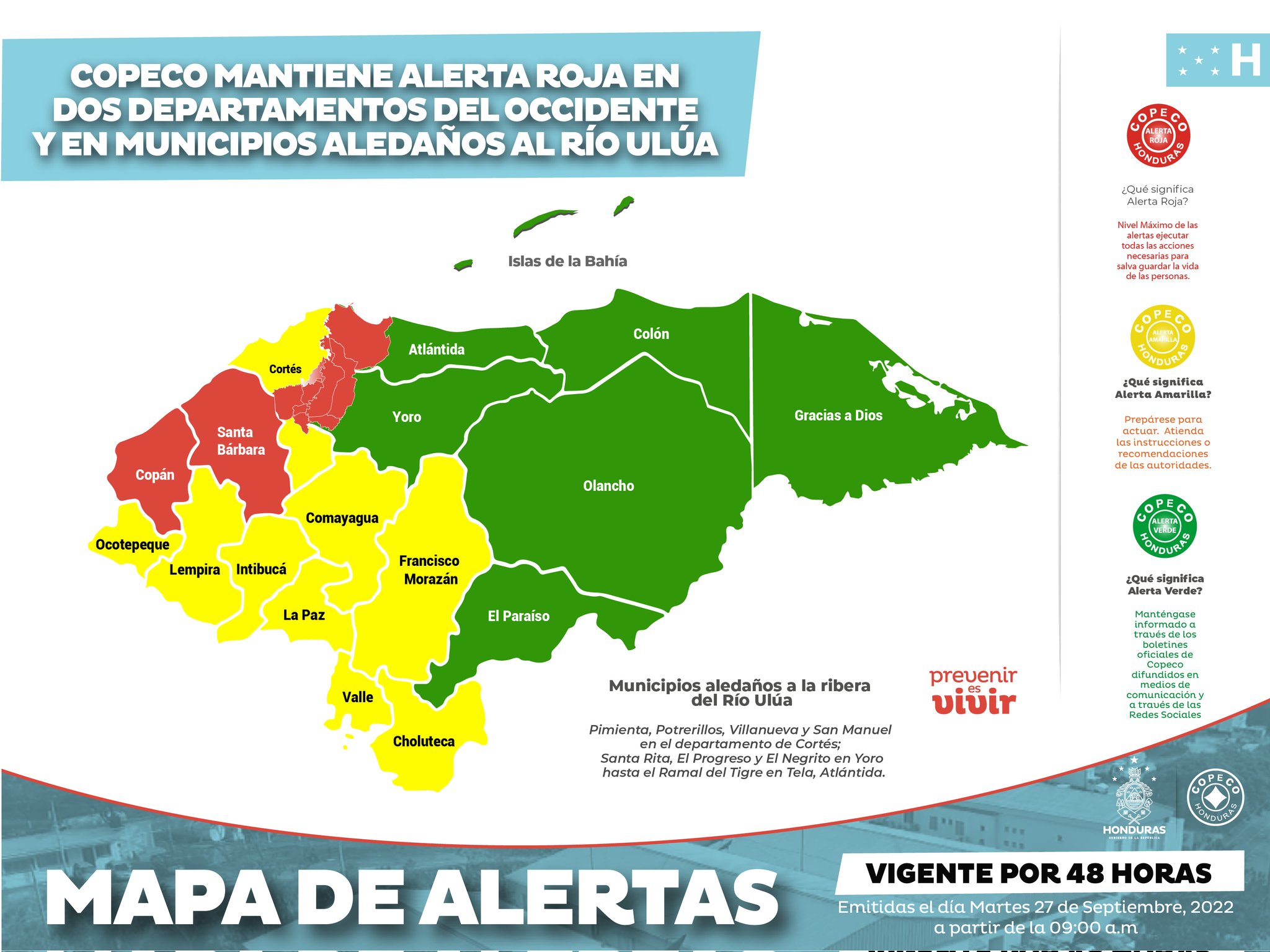 En ese sentido, se mantiene en Alerta Roja, por el mismo período, a los municipios aledaños a las riberas del río Ulúa: Pimienta, Potrerillos, Villanueva y San Manuel en el departamento de Cortés; Santa Rita, El Progreso y El Negrito en Yoro, hasta el Ramal del Tigre en Tela, Atlántida.