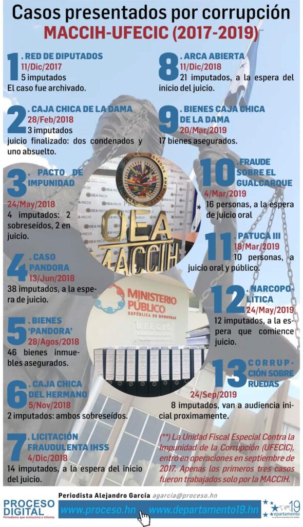En 2016, tras cuestionamientos al expresidente Juan Orlando Hernández y a personas que formaban parte de su gabinete, ingresó al país una Misión de Apoyo Contra la Corrupción y la Impunidad (MACCIH), auspiciada por la Organización de Estados Americanos (OEA), pero se fue en enero de 2020 por falta de voluntad política.