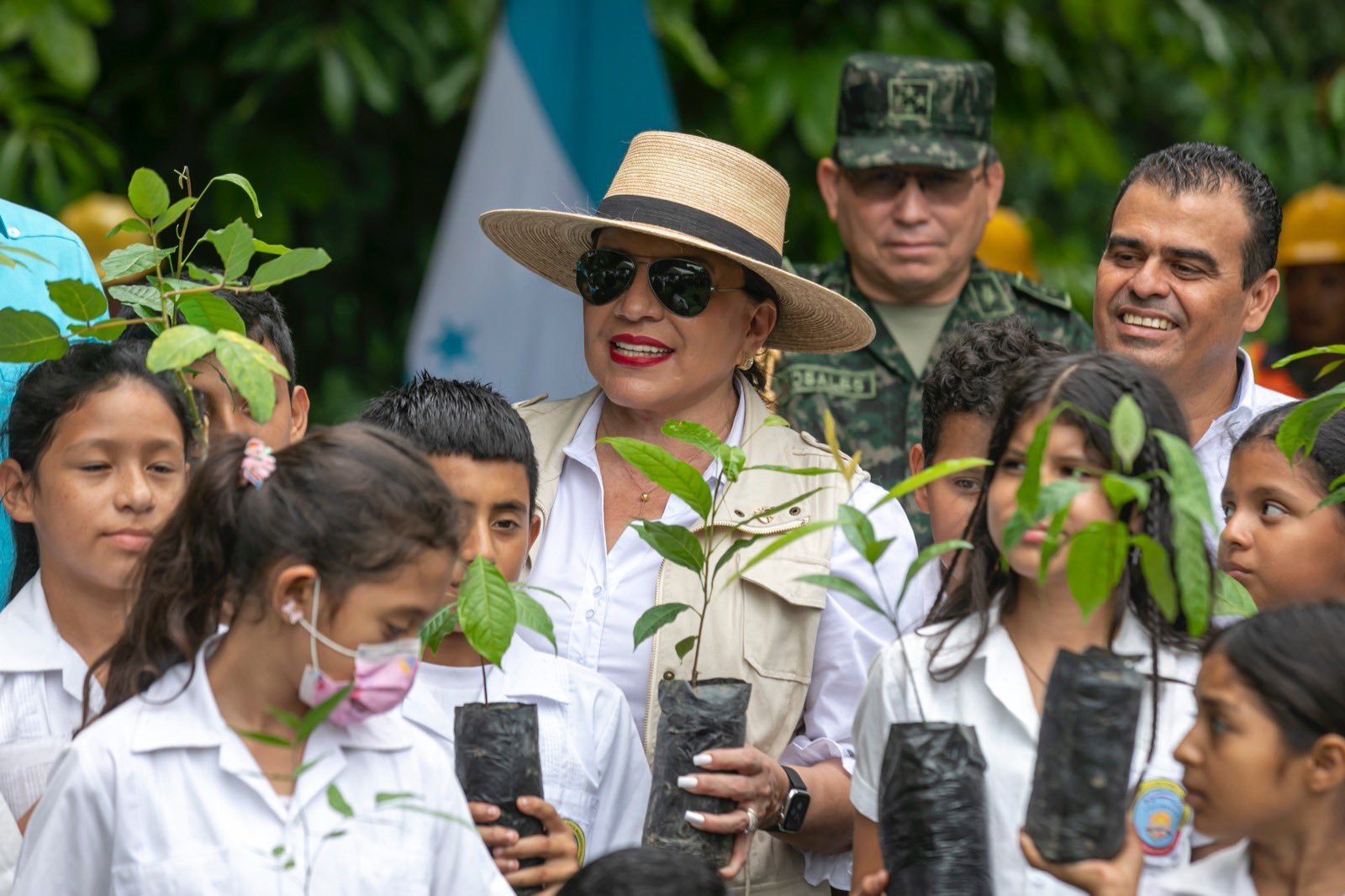 La mandataria, acompañada de su hijo y secretario privado de la Presidencia, Héctor Zelaya, entre otros funcionarios, lanzó una nueva campaña nacional de reforestación desde el Lago de Yojoa, uno de los principales destinos turísticos del país.