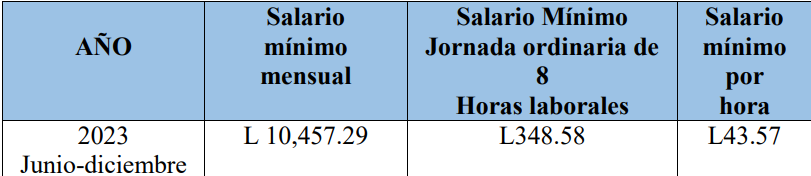La Secretaría de Estado en los Despachos de Trabajo y Seguridad Social y la Comisión Tripartita para la Revisión del Salario Mínimo para el Sector Textil-Maquilador, COMUNICAN: Que, el día de hoy, el Salario Mínimo para el Sector Textil-Maquilador del año 2023 se ha ajustado en base a un acuerdo de voluntad tripartita entre los empleadores, los trabajadores y el Gobierno, y acorde al índice de inflación presentado por el Banco Central de Honduras, en apoyo y consonancia al Gobierno de la República, del 01 de junio al 31 de diciembre del año 2023, debiéndose pagar lo retroactivo a más tardar el 31 de agosto del presente año, quedando establecido de la siguiente manera: