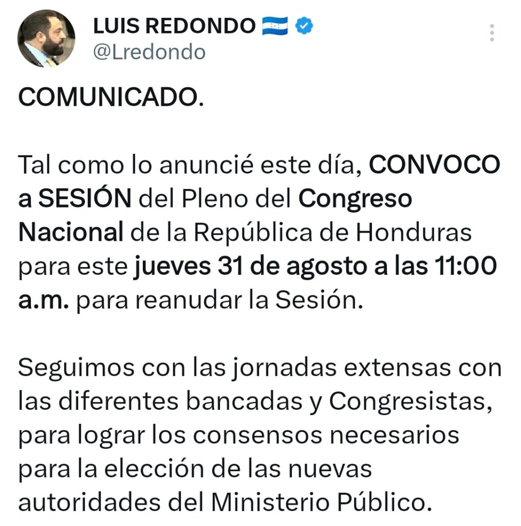 agosto a las 11:00 a.m. para reanudar la sesión”, escribió redondo a