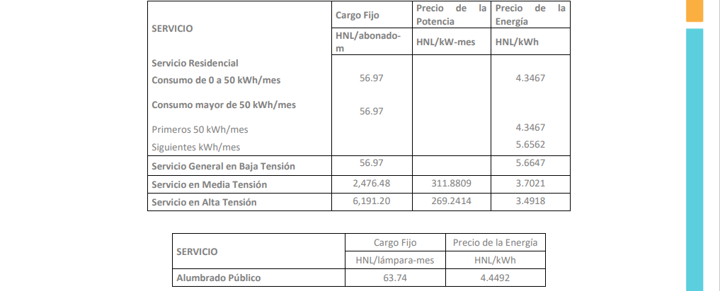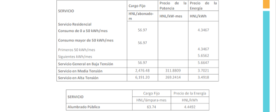 En consecuencia, el organismo autorizó que la estructura tarifaria para la facturación que debe aplicar la Empresa Nacional de Energía Eléctrica (ENEE) a partir del 1 de octubre del 2023es la que se detalla a continuación: